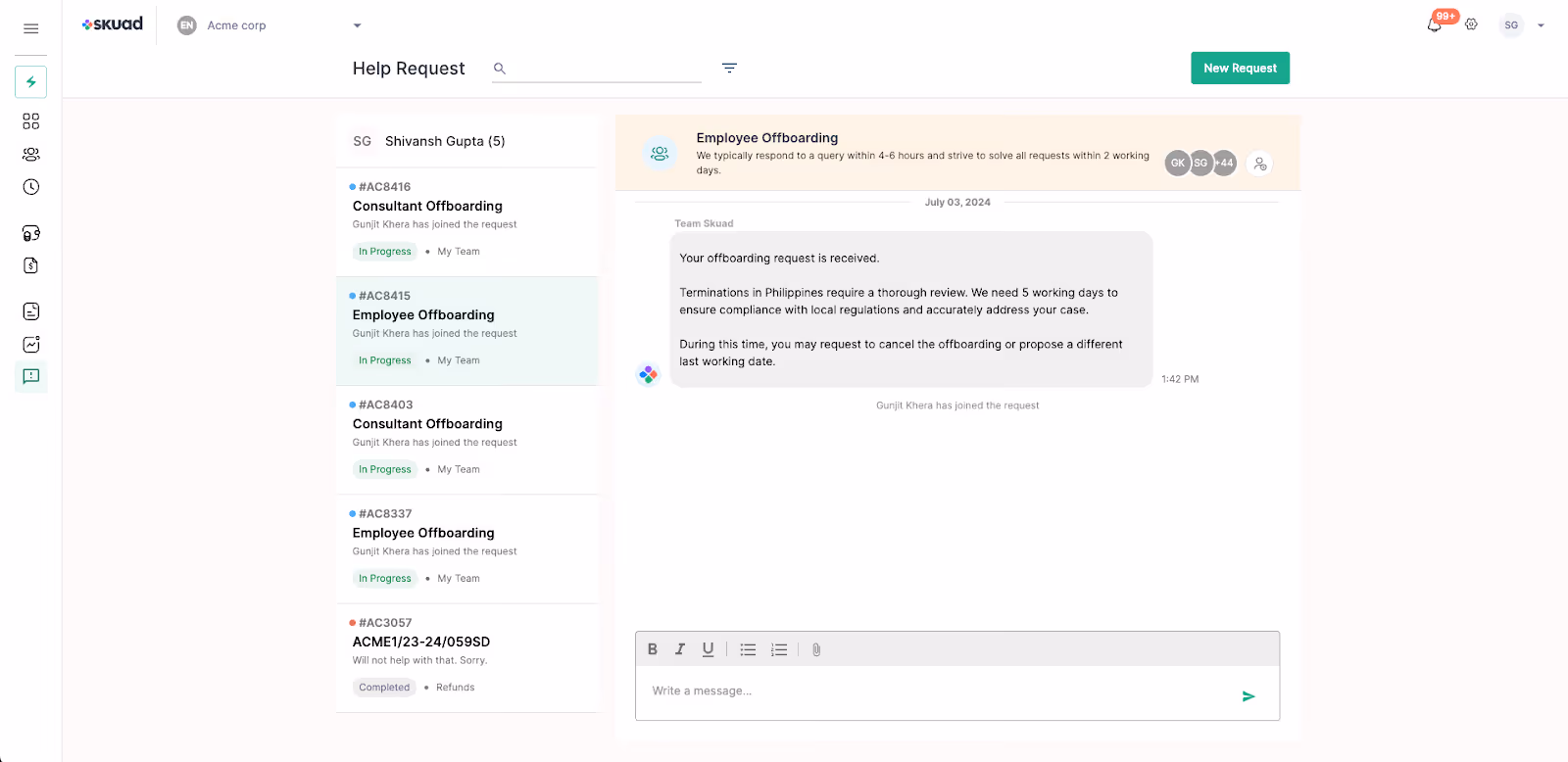 Offboarding requests automatically create a ‘Help Request’ ticket categorized as off-boarding. This streamlines the offboarding process and ensures seamless support from all concerned teams.The impactStay on top of every step in the offboarding journey. Our automated system ensures you never miss an update on offboarding your talent, ensuring increased responsiveness and a smooth transition for your departing employees.