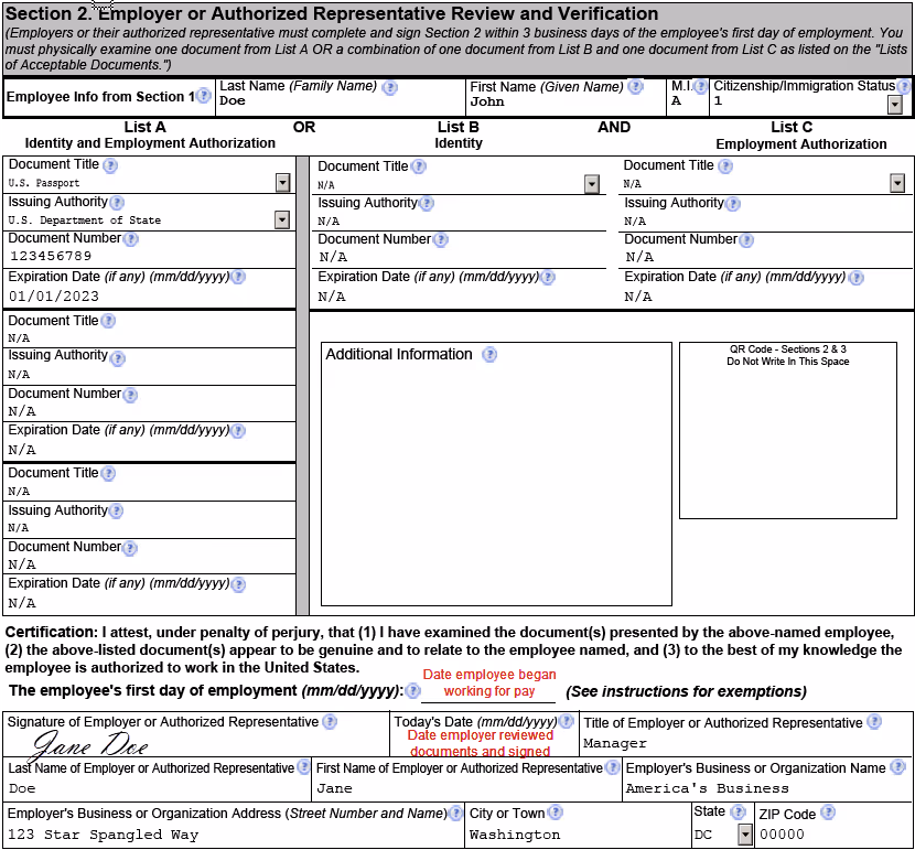 Other details in section two include the employer’s name and address and the name, title, and signature of the individual completing the section. This section must be filled out within three days of the employee’s start date.