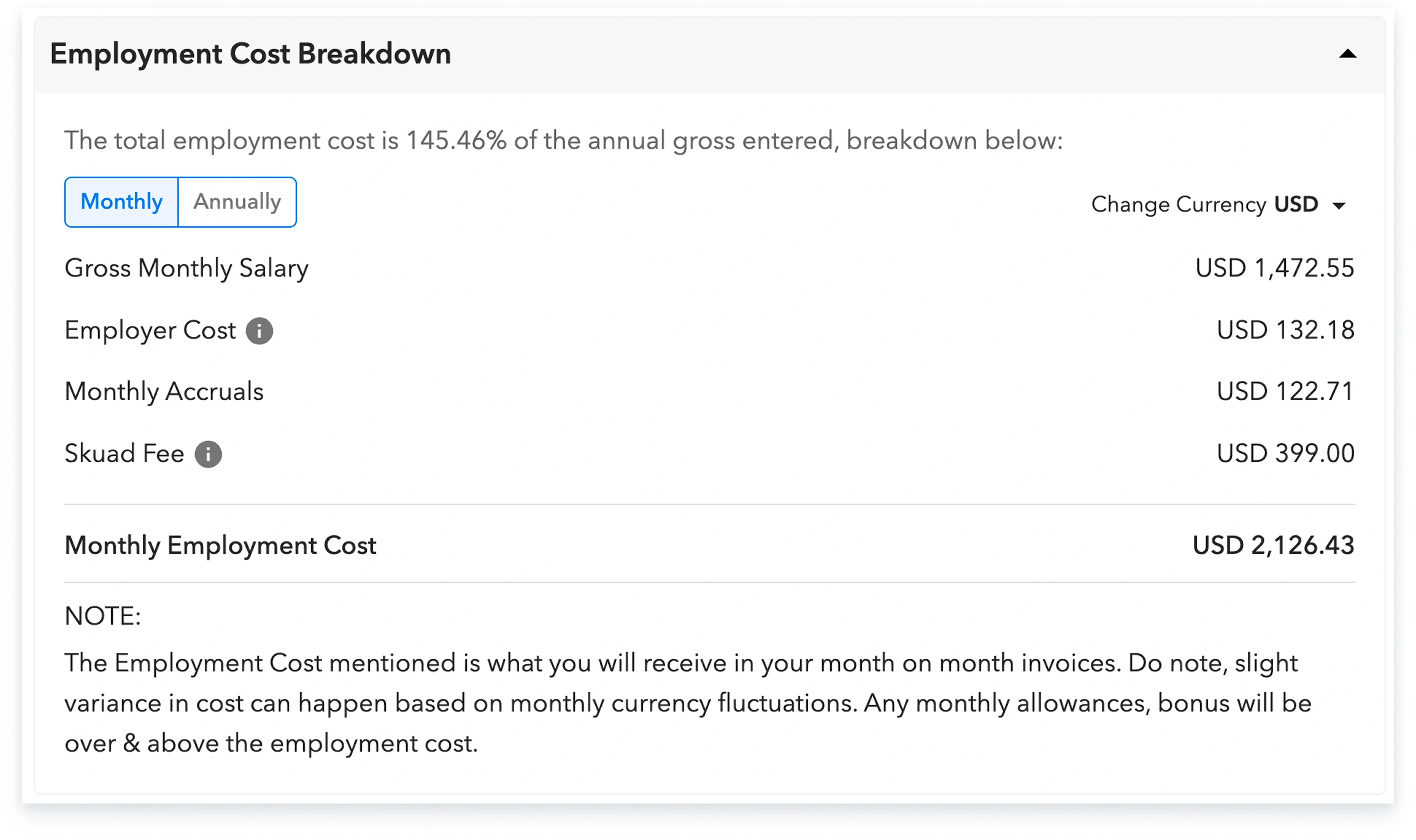 b) Once this is added, you will be able to view a detailed cost breakdown for the new hire.
